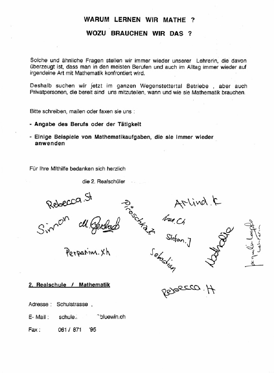 Ihr wollt wissen, wann und wie wir Mathematik in unserem Betrieb brauchen. Wir wollen zuerst festhalten, warum wir von Mathematik nicht sehr viel halten: Mathematik – oder "Mathe", wie Ihr sagt – ist absolut klar und lässt sich völlig ohne jedes Gefühl anwenden!